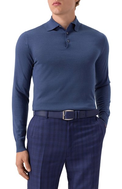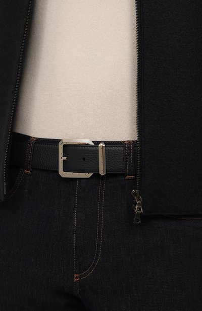Ремень стандартной ширины выполнили из крупнозернистой телячьей кожи. Аксессуар с двумя шлевками регулируется квадратной серебристой пряжкой с рифлеными узорами.