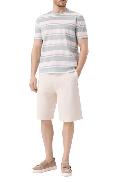 Футболку с горизонтальными полосками разной ширины сшили из хлопкового трикотажа. Модель с круглой горловиной в рубчик украсили фирменным ярлыком внизу.