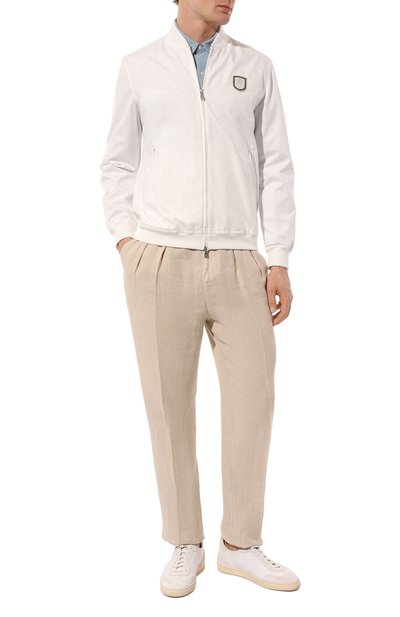 Бомбер с рифленой отделкой и спущенной линией плеч выполнили из хлопкового трикотажа, усиленного шелком. Куртку с брендированной фурнитурой дополнили карманами с клапанами по бокам и накладным с молнией на рукаве.