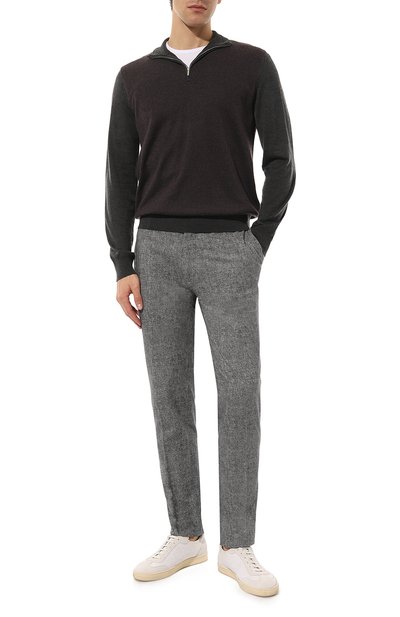 Свободные в бедрах брюки с парными складками спереди сшили из хлопковой ткани в узкую полоску. Модель с регулируемым поясом-кулиской дополнили боковыми карманами и прорезными задними.