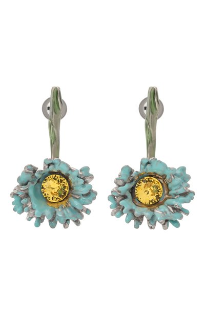 Серьги Flower Pop в виде цветка выполнили из латуни с гальваническим покрытием палладием. Изделие с застежкой-пусетой украсили граненым кристаллом и глянцевой эмалью.