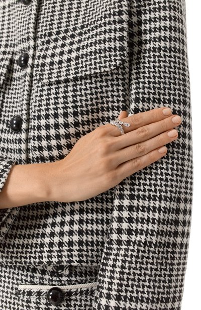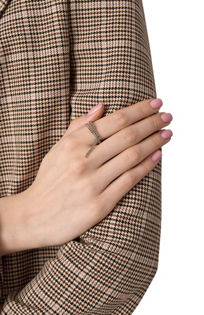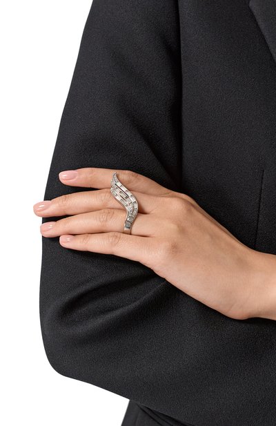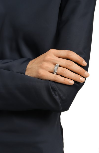 Асимметричное кольцо с объемным цветочным бутоном выполнили из серебристой латуни с гальваническим покрытием. Аксессуар дополнили вставками из кристаллов и жемчужной бусиной.