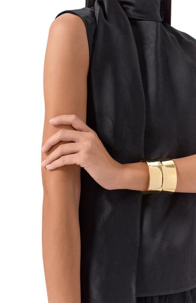Незамкнутый широкий браслет изготовили из олова и латуни. Аксессуар с рельефным мотивом украсили эмалированными полосами и логотипом на внутренней стороне.