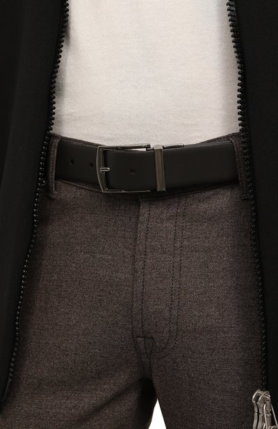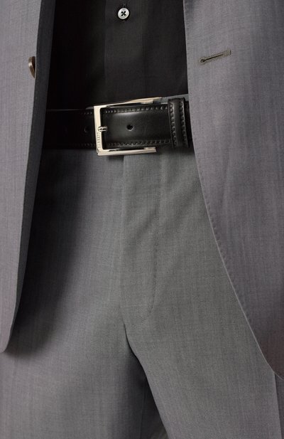 Ремень стандартной ширины выполнили из зернистой кожи. Аксессуа р с двумя тренчиками застегивается квадратной пряжкой из серебристого полированного металла.