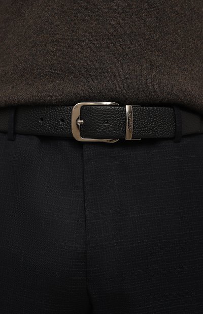 Для изготовления ремня с двумя тренчиками использовали фактурную кожу. Модель с брендированной заклепкой застегивается прямоугольной серебристой пряжкой с выгравированным логотипом.
