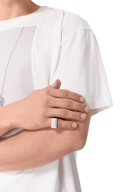 Широкое кольцо выполнено из латуни с гальваническим покрытием палладием. На украшении с зеркальным блеском выгравирован фирменный числовой код.