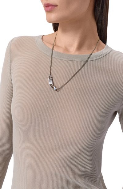 Колье-цепочку с застежкой «лобстер» выполнили из латуни. Модель украсили вставкой в виде пластины с фирменным числовым кодом, подчеркнутым покрытием эмалью.