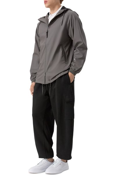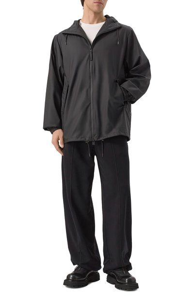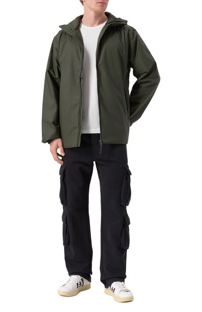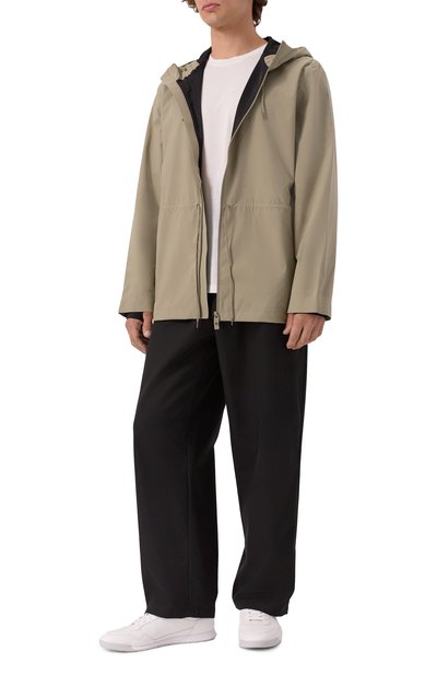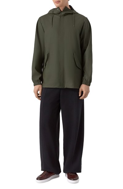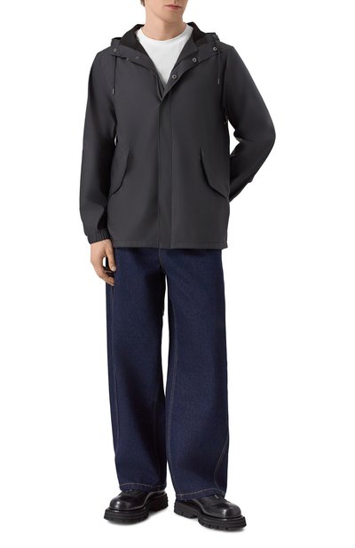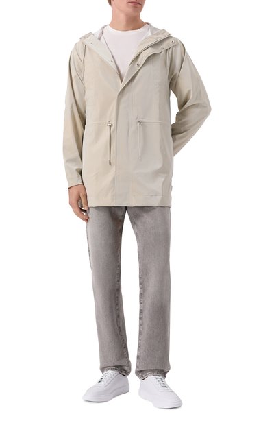 Парка Fishtail с отлетной кокеткой, эластичными манжетами и боковыми карманами застегивается молнией, скрытой под клапаном с кнопками. Модель с термосварными швами выполнили из водонепроницаемого полиэстерового текстиля, покрытого полиуретаном. Капюшон, дополненный козырьком, и асимметричный низ регулируются продетыми в кулиски шнурками.