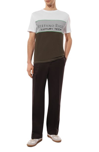 Футболку с изображением кошек на клетчатом фоне сшили из хлопкового джерси. Модель органично впишется и в повседневный образ с потертыми джинсами, и в более элегантный с классическими брюками.