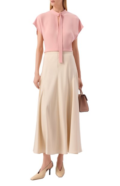 Длинную юбку с высоким боковым разрезом выполнили из кади на основе вискозы и ацетата. Пояс модели декорировали кристаллами и бисером. Изделие на молнии сбоку составит идеальный дуэт с парным топом.