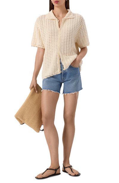 Кардиган с короткими рукавами и отложным воротником станет альтернативой топу или футболке. Модель с узором пуантель выполнена из вискозной пряжи, укрепленной полиэстером.