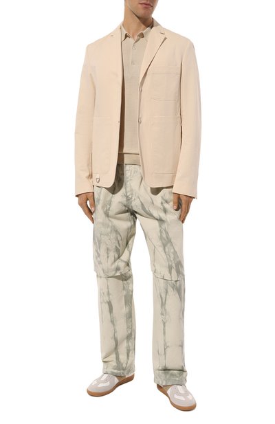 Пиджак с шевронным узором сшили из хлопкового материала, не используя подклад. Модель с прямоугольными лацканами и двумя шлицами дополнили внутренним и тремя внешними карманами. В петлице закрепили фирменную брошь.