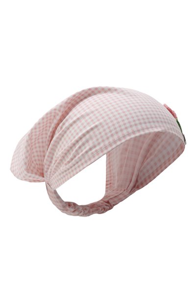 Повязку в виде косынки с эластичной вставкой сшили из чистого хлопка в клетку виши. Связанную крючком аппликацию-цветок дополнили брендированным медальоном-сердцем.