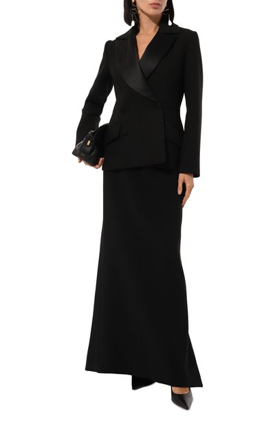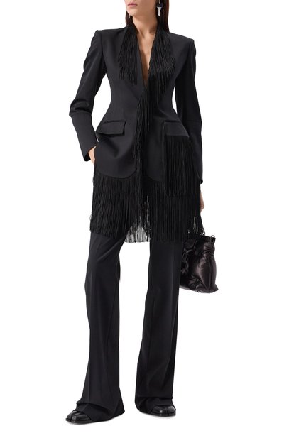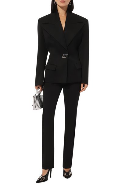 Приталенный однобортный жакет с открытыми плечами сшили из комбинации вискозы и шерсти. Изделие дополнили двумя врезными карманами и вставкой, напоминающей бюстгальтер с регулируемыми бретелями.