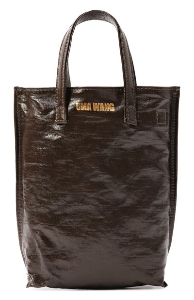 Сумку с двумя короткими ручками сшили из льняного текстиля с глянцевым покрытием. Из такого же материала выполнили съемный плечевой ремень. Спереди аксессуар украсили логотипом.