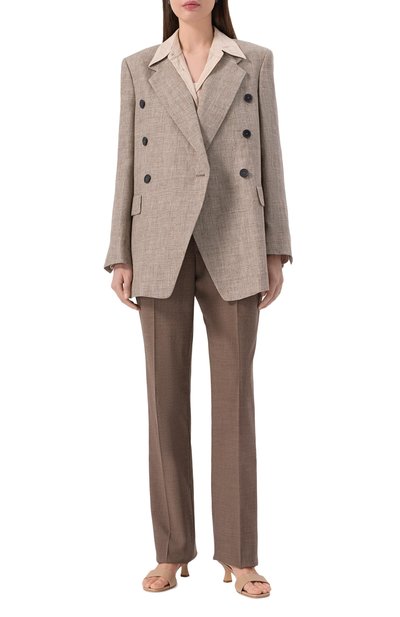Двубортный жакет с атласным подкладом сшили из микса вискозы и льна. Модель дополнили боковыми карманами с клапанами. Наши стилисты предлагают сочетать из делие с платьем в тон.