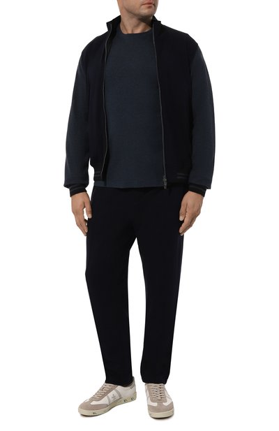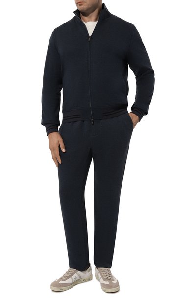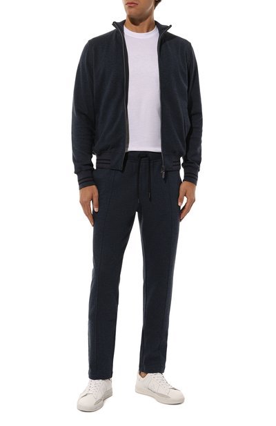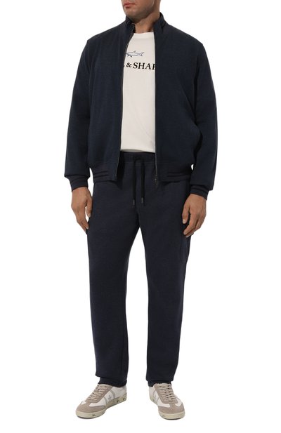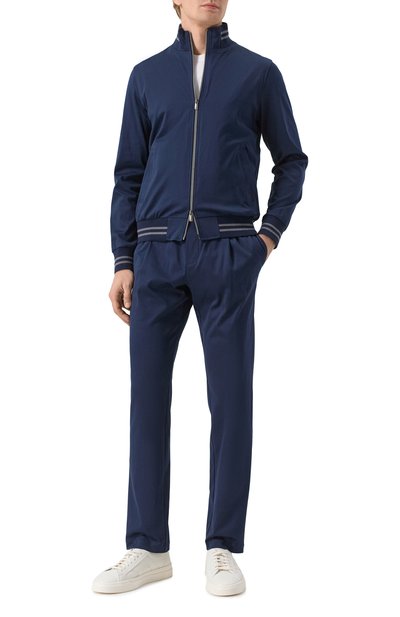 Толстовку с рифлеными поясом, манжетами и воротником-стойкой сшили из хлопкового джерси, усиленного полиэстером. Модель с брендированной пластиной на спинке, как и боковые карманы, застегивается молнией.