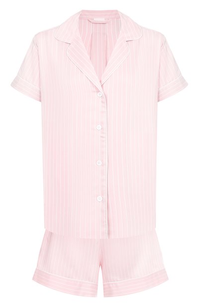 Полосатая пижама из микса вискозы и шелка вошла в коллекцию Feminine Stripes. Рубашку со складкой на спинке и шорты с эластичным поясом декорировали широкими отворотами. Края подчеркнули атласным кантом.