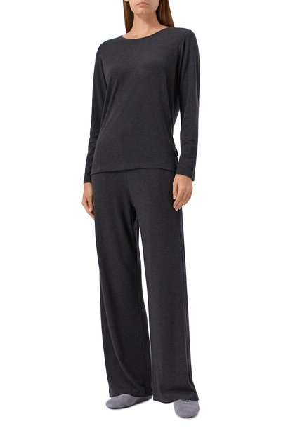 Для пошива брюк из линии Soft Lounge использовали стрейчевый трикотаж на основе тенсела. Меланжевую модель оттенка Cloud дополнили широким эластичным поясом и двумя боковыми карманами.