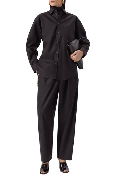 Приталенную рубашку с отложным воротником и кокеткой на спинке сшили из вискозной ткани с добавлением шелка. Таким же материалом обтянули крупные пуговицы спереди и на манжетах.