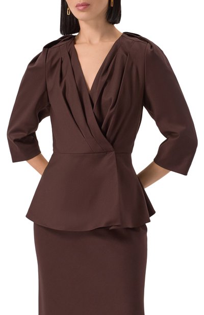 Блузу с объемными рукавами и супатной застежкой сшили из хлопкового поплина, задрапировав вдоль горловины. Модель составит идеальный дуэт и с парной юбкой, и контрастными вещами.