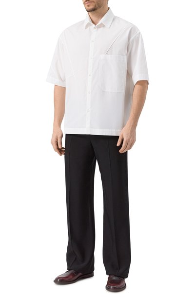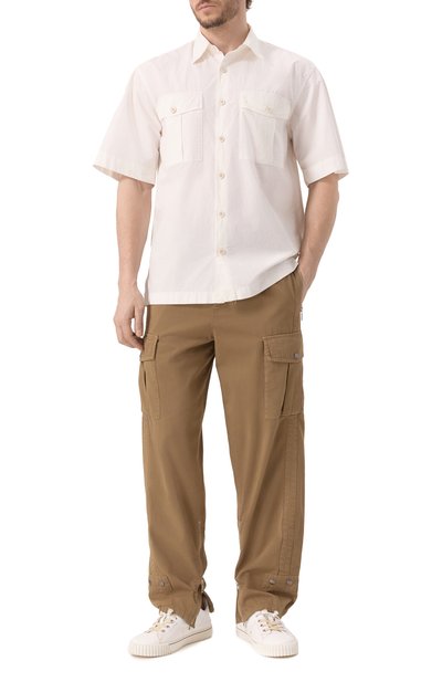 Рубашка прямого кроя сшита из органического хлопкового поплина. Однотонная модель украшена небольшим логотипом марки, будто выглядывающим из нагрудного кармана.
