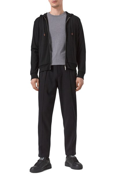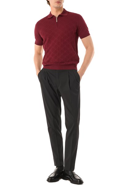 Брюки со стрелками выполнили из слегка эластичного габардина на основе лиоцелла с добавлением хлопка, окрасив модель в готовом виде. Над одним из четырех карманов разместили брендированную пластину.