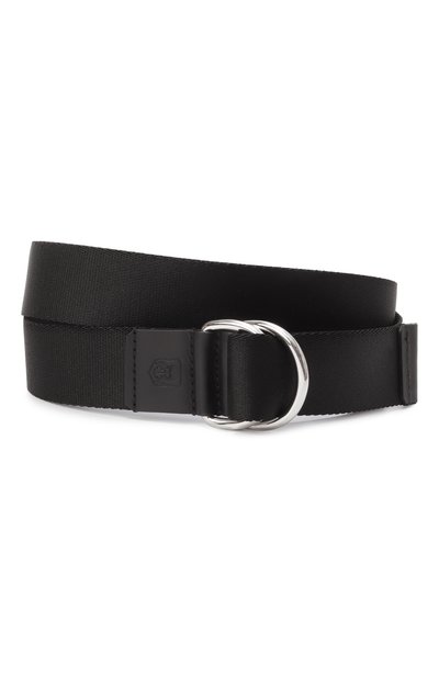 Аксессуар с D-образными серебристыми пряжками и отделкой из кожи украшен тисненым символом марки. Ремень из плотного текстиля органично дополнит повседневный образ с джинсами или брюками.