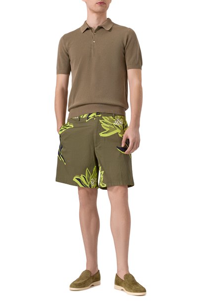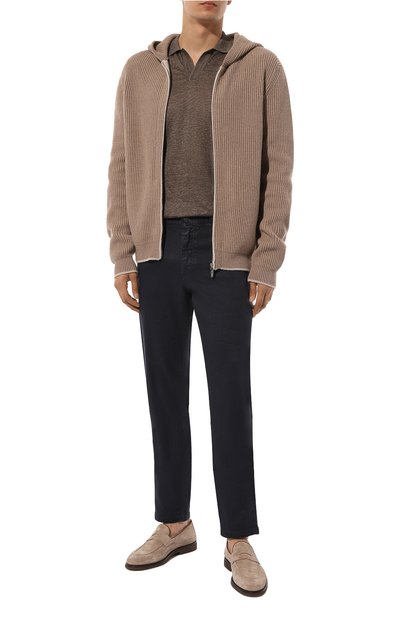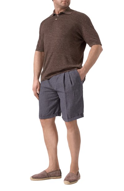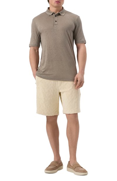 Поло с тремя пуговицами выполнили из ребристого трикотажа на основе льна и хлопка. При окрашивании материал неравномерно впитал пигмент, поэтому модель получилась меланжевой.