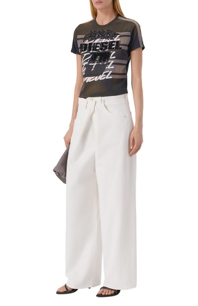 Джинсы Khris с контрастными швами выполнили из хлопкового денима. Пятикарманную модель barrel leg декорировали фирменным фигурным патчем на поясе сзади.