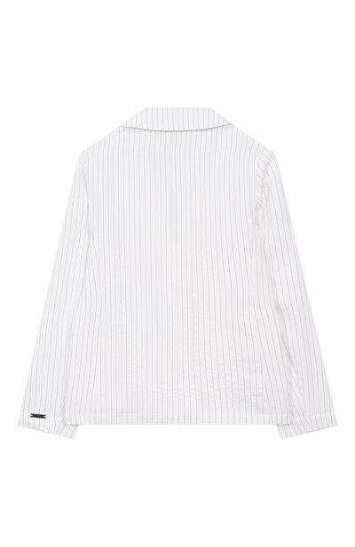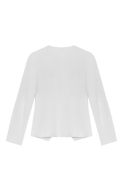 Жакет с воротником-стойкой и укороченными рукавами выполнили из полупрозрачного полиэстера и декорировали вышивкой в тон. Модель застегивается золотистыми брендированными пуговицами, в тон которым – металлическая эмблема на низе.