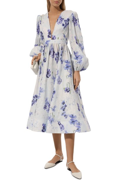Платье Maxine с двумя накладными карманами выполнили изо льна с принтом Cornflower Paisley. Модель с боковыми разрезами застегивается потайной молнией сзади.