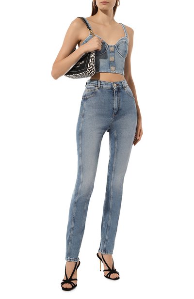 Выбеленные джинсы с пятью карманами сшили из жесткого денима. Пояс со шлевками украсили фирменным жакроном, а отвороты на брючинах — жаккардовыми вставками с графичным мотивом.