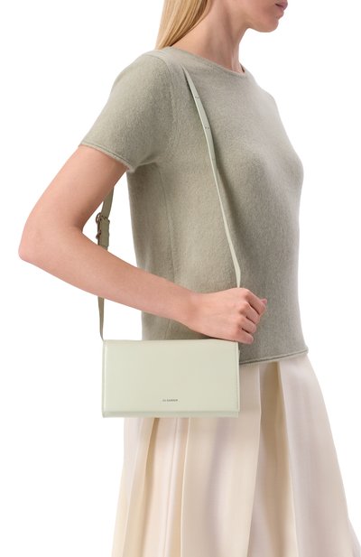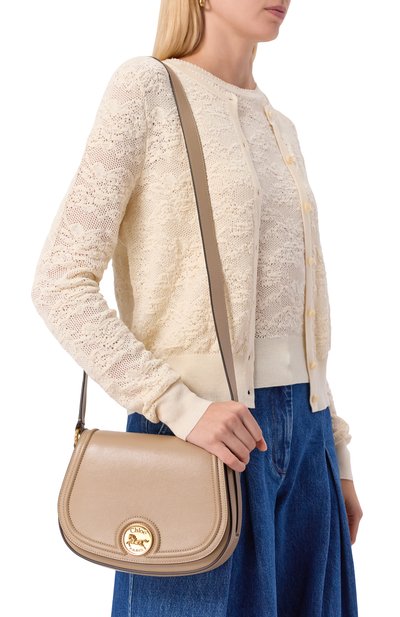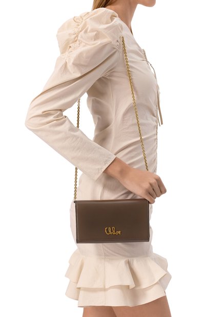 Мини-сумка из мелкозернистой телячьей кожи вошла в коллекцию Chloe Iconic. Аксессуар с клапаном на магнитной кнопке декорировали металлическим фирменным логотипом. Два основных отсека разделили монетным карманом на молнии, дополнив модель внутренними слотами для карт и чеков. В комплекте – съемный ремень-цепочка.