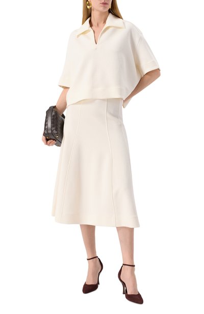 Асимметричную миди-юбку выполнили из цельного отреза вискозного трикотажа с добавлением полиэстера. Наши стилисты предлагают поддержать повседневный образ парным пуловером с короткими рукавами.
