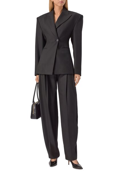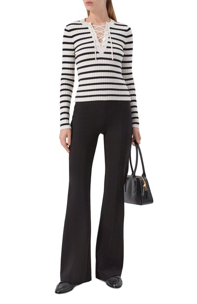 Для пошива расклешенных брюк с широким поясом и четырьмя врезными карманами использовали вискозу. Модель украсили сверкающими пайетками со всех сторон. Наши стилисты предлагают создать монохромный образ с парной блузкой и босоножк ами.
