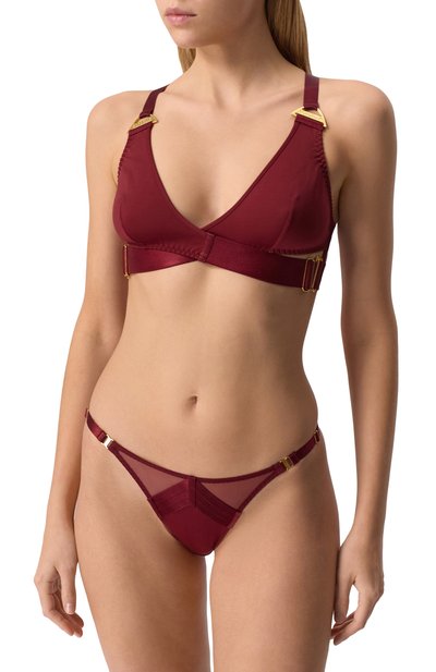 Стринги Syra с трикотажной ластовицей выполнили из микрофибры и полупрозрачной стрейчевой сетки оттенка Morello. Отрегулировать посадку трусов позволяют атласные ленты с брендированной фурнитурой, покрытой 24-каратным золотом.