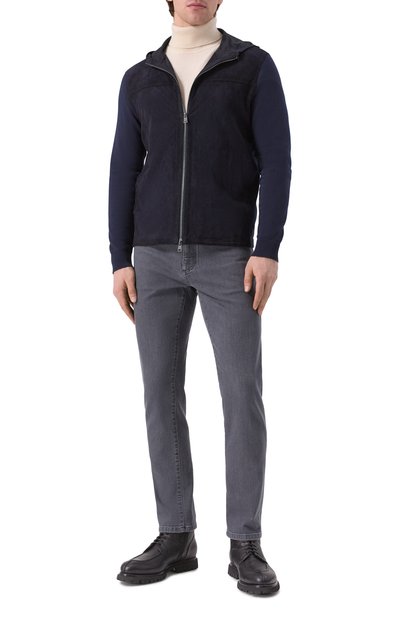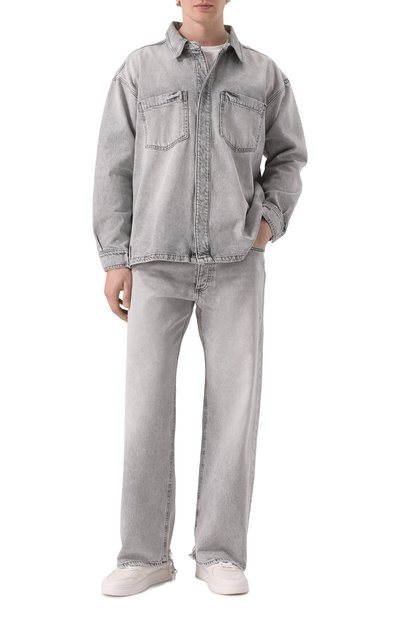 Куртку с капюшоном, накладными карманами и эластичными манжетами и поясом сшили из денима. Выбеленную модель на встречной молнии с пуллерами-кольцами украсили спереди контрастной надписью Personal use only.