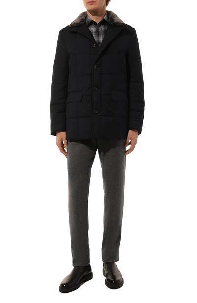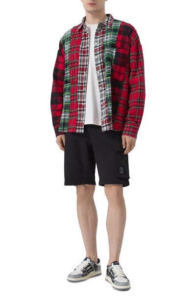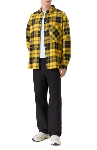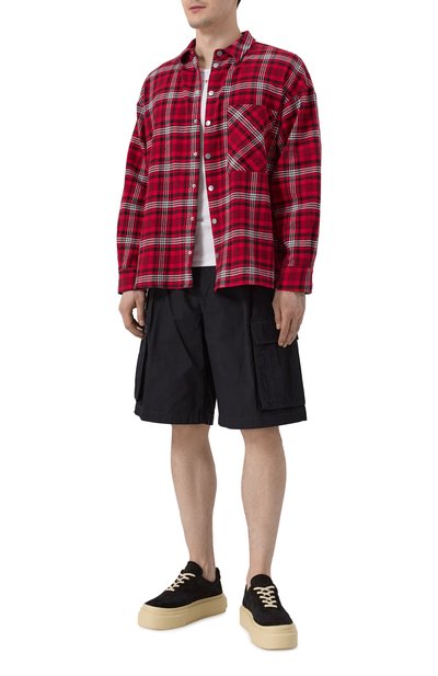 Клетчатую куртку-рубашку с однотонным капюшоном сшили из плотной хлопковой ткани с добавлением акрила. Модель с фигурным низом и спущенной линией плеч дополнили боковыми карманами и накладными нагрудными с клапанами.