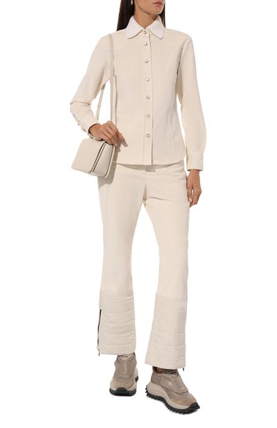 Блузка с закругленным подолом и контрастным кантом по краям сшита из микса ацетата и шелка. Модель прямого кроя украшена сзади небольшой петлей с фирменной эмблемой марки.
