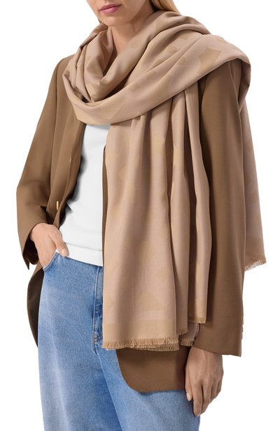Палантин украсили брендированным паттерном и окантовкой в полоску с логотипом. Аксессуар с короткой бахромой на концах изготовили из вискозного твила.