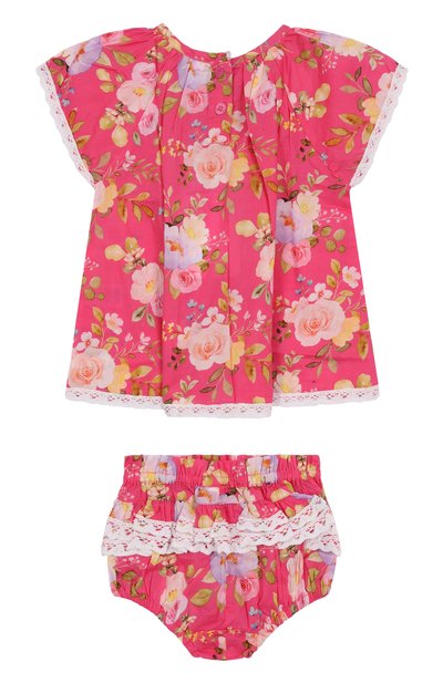 Футболку с брендированной вышивкой спереди и пуговичной застежкой сзади выполнили из хлопкового джерси стрейч и сирсакера в полоску. В комплект включили шорты с эластичной отделкой по краям и на поясе.