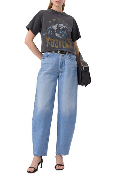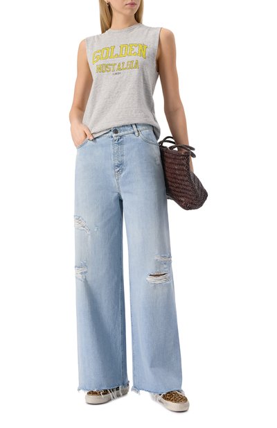 Расклешенные пятикарманные джинсы Traveller с потертостями по краям и крупным разрывом с бахромой сшили из хлопкового денима. Ширинку дополнили фирменным алым ярлыком с логотипом марки, которому вторит патч на поясе сзади.