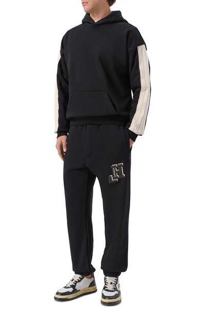 Джоггеры с эластичным поясом-кулиской, задним и двумя боковыми карманами выполнили из хлопкового трикотажа с добавлением полиэстера. Спереди модель украсили контрастным логотипом марки и узорами Racing.