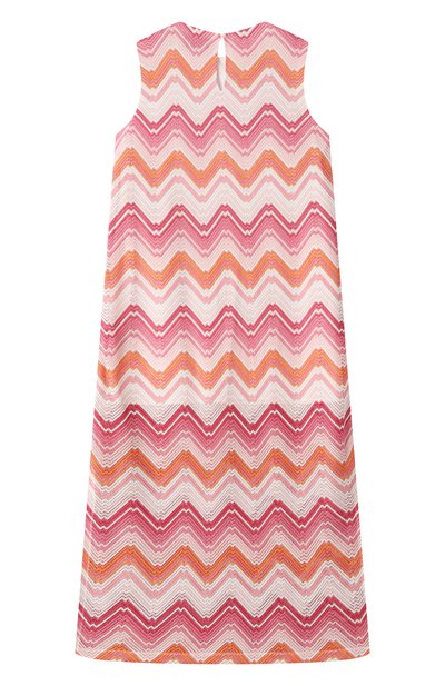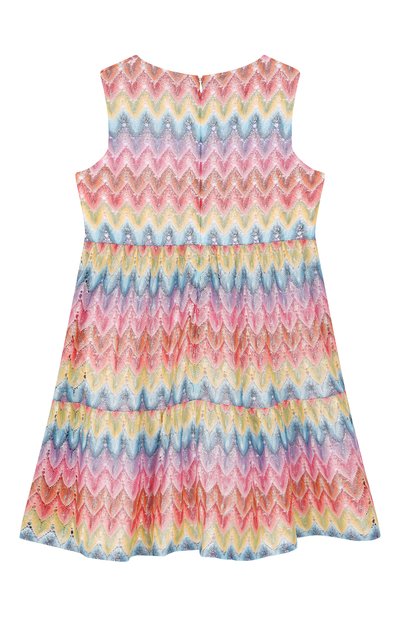Платье с фирменным узором зигзаг выполнили из трикотажа на основе хлопка. Модель, украшенная брендированной пластиной на талии, застегивается потайной молнией сзади.