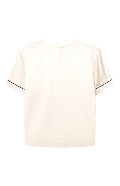 Топ с потайной молнией на спинке сшили из ажурного вискозного трикотажа с фирменными зигзагами. Модель, украшенную бренди рованной золотистой пуговицей спереди, дополнили хлопковым подкладом и эластичным полосатым поясом.