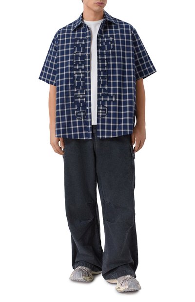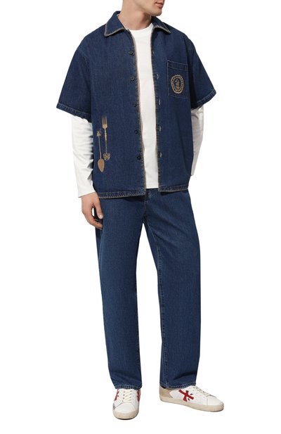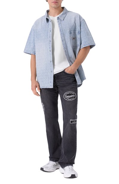 Джинсовую рубашку D-Nabil-Fsg, вдохновленную одеждой для боулинга, сшили из тенсела. Модель с брендированными кнопками и вышитой эмблемой фирменного алого оттенка состарили при помощи стирки с искусственными камнями и обработки лазером.