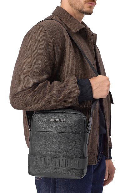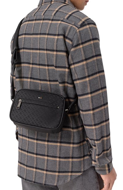 Для изготовления сумки с гладкой отделкой использовали усиленную полиэстером хлопковую ткань. Брендированному паттерну на материале вторит накладка в виде эмблемы и тотемного орла. Модель с регулируемым ремнем дополнили спереди и внутри карманами с молниями.