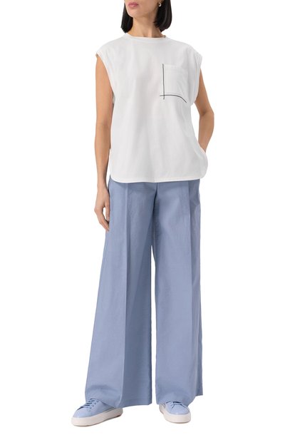 Меланжевую футболку с приспущенной линией плеч выполнили из хлопка с добавлением льна. Горловину модели дополнили завязками в тон, а сзади изделие украсили узором с эмблемой бренда.