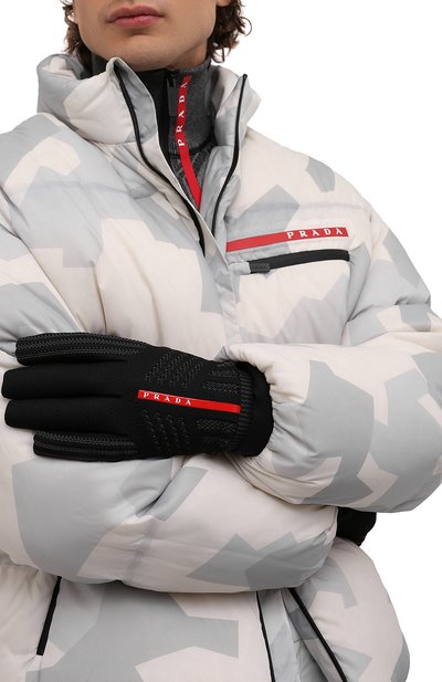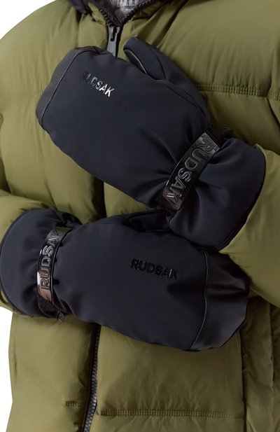 Перчатки с манжетами на резинках выполнили из нейлона, укрепив ладонь более плотным материалом. На тыльной стороне левого изделия вышили фирменную эмблему в тон, а сбоку предусмотрели фастекс, соединяющий пару.